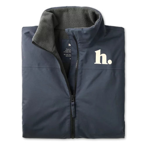 Polar fleece lining on body, neck and sleeves, zipped inside pocket, two zipped outside pockets covered with fabric for extra waterproofing, ribbed cuffs and waistband, Hoalen logo printed on chest and Hoalen Sailing logo printed on back below neck.