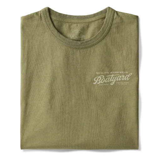 The Boatyard Tee Military Green is a sturdy T-shirt made from thick 290 gsm cotton, designed to last. Its piece dyeing and chest and back prints give it an authentic look, faithful to the workwear and nautical spirit of the Boatyard capsule collection.