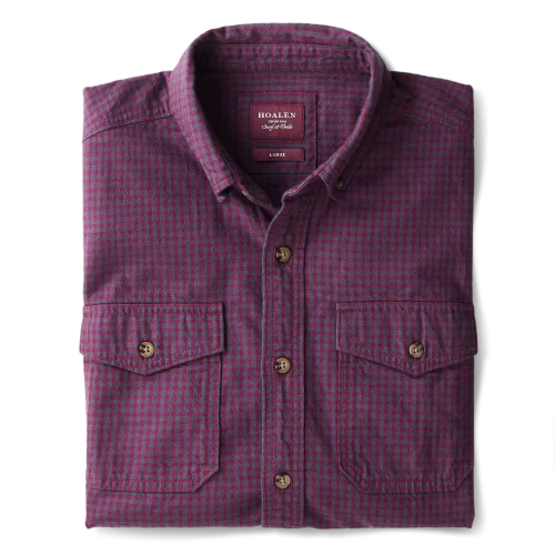 Its gray and burgundy gingham pattern gives it a classic, timeless look. The engraved horn buttons, flap chest pocket, and discreet woven labels are evidence of meticulous, durable craftsmanship.
