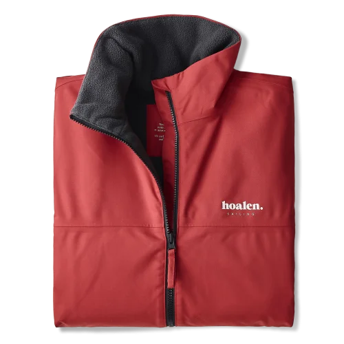 Fleece lining on body, neck and sleeves, zipped inside pocket, two zipped outside pockets covered with fabric for extra waterproofing, ribbed cuffs and waistband, Hoalen Sailing logo printed on chest, Hoalen logo on right shoulder and Hoalen seaweed logo on lower left sleeve.