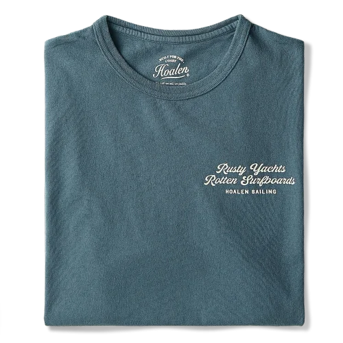 Round neck, ribbed collar, “Rusty Yachts, Rotten Surfboards” graphic printed on the chest.