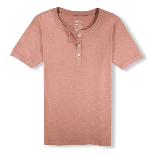 Scoop neck with button placket, small "Hoalen" fabric label sewn on the hip.