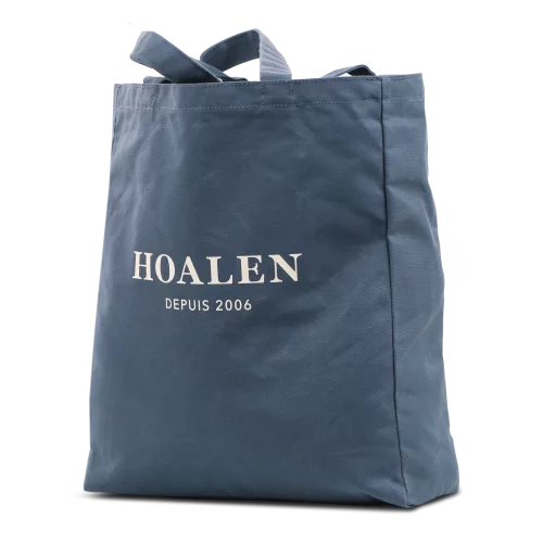 Rectangular shape, shoulder carry. Inside zipped pocket. Large "Hoalen since 2006" print on the outside .