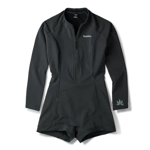 Col montant, manches longues, demi fermeture éclair centrale écrue, coupe shorty, logo Hoalen imprimé sur la poitrine et logo algue Hoalen imprimée sur la manche gauche.