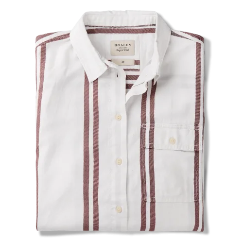 Confectionnée en 100 % coton, la chemise Madenn est réalisée dans un twill léger de 160 gsm, agréable à porter en saison douce. Son tissu à rayures imprimées, au motif à bandes rouges, lui confère un style affirmé tout en restant facile à associer.