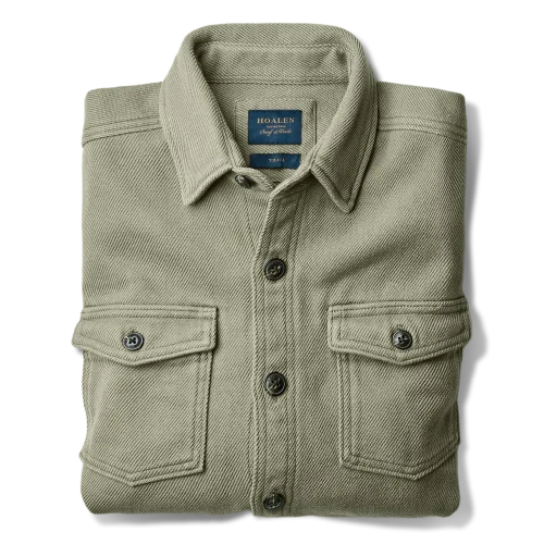 Manches longues, col boutonné, deux poches poitrines boutonnées à revers, étiquette tissu Hoalen cousue sur la hanche, petite étiquette tissu Seabass fish cousue sur le bas de la manche gauche.