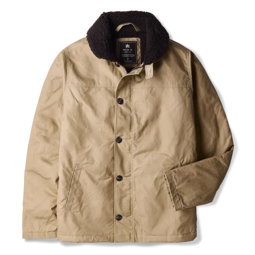 Pour la toile extérieure de cette veste, nous avons fait le choix du tissu « Staywax Sahara 6 ». Ce tissu à l'aspect waxé est à la fois robuste et souple. Facile d'entretien, il contient un mélange unique de cires qui présentent l'avantage de pouvoir être lavées en machine. Il est développé par British Millerain, une manufacture fondée en 1880 dans le Yorkshire spécialisée dans le développement de matières déperlantes. Elle est historiquement connue pour la qualité et la résistance de ses tissus qui à l'origine équipaient les marins pêcheurs des petits chalutiers de la côte anglaise.