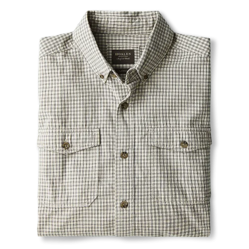 Son motif à petit carreaux lui confère une allure classique et intemporelle. Les boutons en corne gravés, les poches poitrine à rabat et les étiquettes tissées discrètes témoignent d’un travail minutieux et durable.