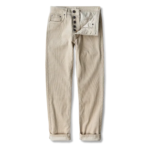 Velours à côtes moyennes 11W, fermeture à boutons, cinq poches : trois à l'avant, deux poches plaquées à l'arrière, petite étiquette Hoalen cousue sur le côté de la poche arrière.