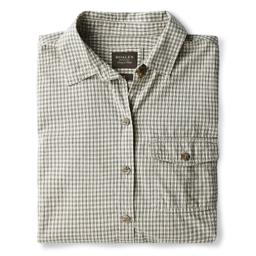 Son motif à petit carreaux lui confère une allure classique et intemporelle. Les boutons en corne gravés, la poche poitrine à rabat et les étiquettes tissées discrètes témoignent d’un travail minutieux et durable.