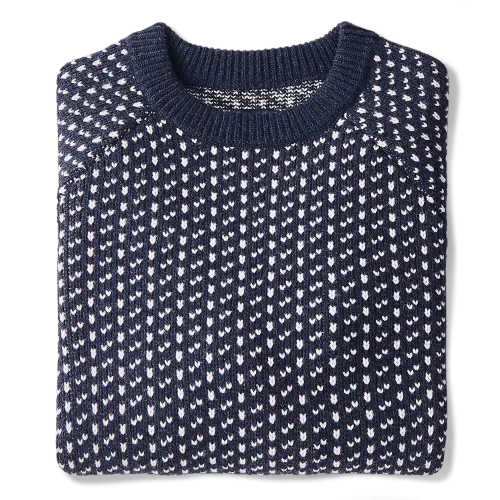 Son jeu de couleurs contrastées entre le bleu marine et l’écru met en valeur un motif jacquard discret, à la fois graphique et intemporel. Les bord-côtes au col, aux poignets et à la taille assurent un maintien confortable et une belle tenue dans le temps.