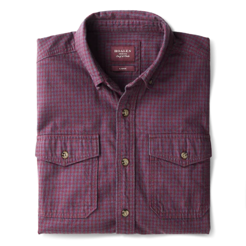 Son motif vichy gris et bordeaux lui confère une allure classique et intemporelle. Les boutons en corne gravés, la poche poitrine à rabat et les étiquettes tissées discrètes témoignent d’un travail minutieux et durable.