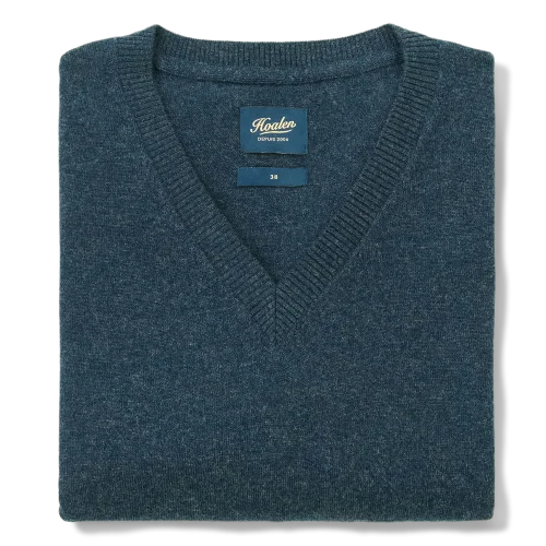 Pull col V, finitions bord-côtes au col, aux manches et à la taille, petite étiquette Hoalen cousue sur la hanche.