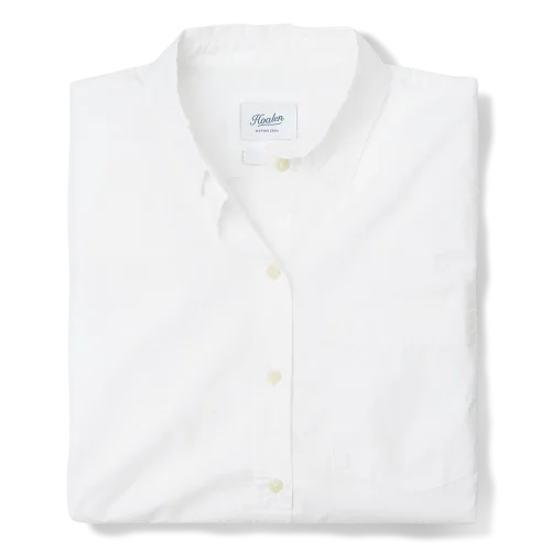Manches longues, col boutonné, poignets arrondis, une poche poitrine, étiquette tissu Hoalen cousue sur la hanche.
