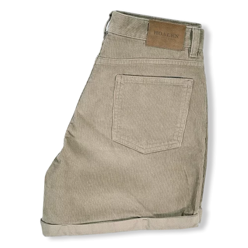 Fermeture zippée et bouton à la ceinture, trois poches devant, deux poches arrières, badge en cuir embossé Hoalen depuis 2006 à l'arrière de la ceinture, ourlet au bas du short.