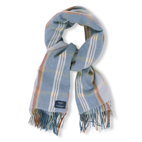 Petite étiquette "Hoalen depuis 2006 x Locharron of Scotland" au bas de l'écharpe.