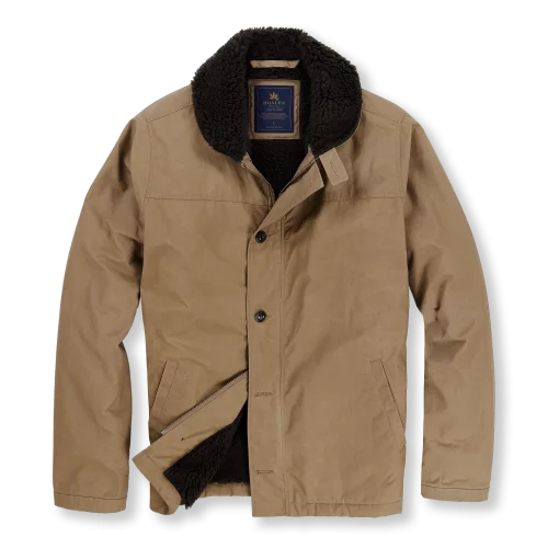 Pour la toile extérieure de cette veste, nous avons fait le choix du tissu « Staywax Sahara 6 ». Ce tissu à l'aspect waxé est à la fois robuste et souple. Facile d'entretien, il contient un mélange unique de cires qui présentent l'avantage de pouvoir être lavées en machine. Il est développé par British Millerain, une manufacture fondée en 1880 dans le Yorkshire spécialisée dans le développement de matières déperlantes. Elle est historiquement connue pour la qualité et la résistance de ses tissus qui à l'origine équipaient les marins pêcheurs des petits chalutiers de la côte anglaise.